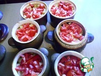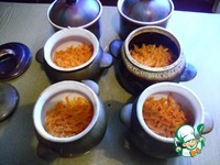 Сверху укладываем мелко нарезаный репчатый лук. Добавляем по одной чайной ложке растительного масла. |