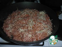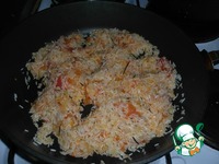 3. Добавляем огонь. Через одну минуту выкладываем в сковороду рис, а еще через минуту – вино. |