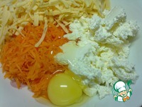Берем творог, вбить в него яйцо, добавить натёртую морковь и натёртый на крупной тёрке сыр. Все перемешать. |