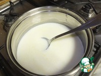 В небольшой кастрюльке растопить сливочное масло. В растопленное масло налить кефир, перемешать, снять с огня и добавить соду. |