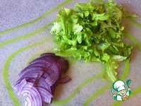 Лук нарезать четверть дольками, листы салата порвать руками на небольшие кусочки. |