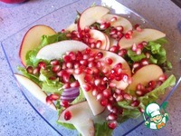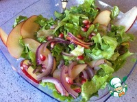 Положить в салатницу листья салата, лук, яблоки и добавить горсть-две гранатовых зерен. |