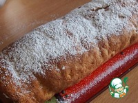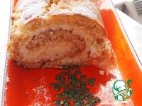 Потом разворачиваем наш рулет, намазываем крем и сворачиваем его обратно. Рулет получается довольно толстенький. Посыпаем сверху сахарной пудрой. Ставим в холодильник и ждем 1 час. |