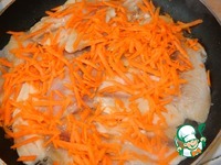 Затем её переворачиваем, делаем огонь меньше и выкладываем сверху тертую морковь. |