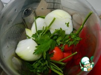 Отдельно в блендере измельчаем помидоры, лук, петрушку, соль, специи. |