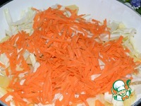 Морковь натереть на крупной терке и добавить в сковороду. |