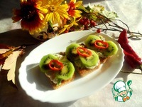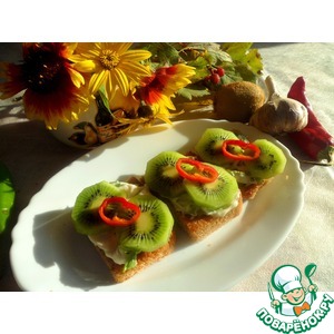 Порезать слайсы очищенного киви и положить сверху, окончательно украшаем кружочками перца чили. Наша закуска готова- угощайтесь! |