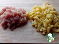 Картофель и куриное филе нарезать мелкими кубиками. |