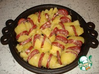 В смазанную маслом глубокую сковороду выложить чередуя ломтики картофеля и колбасы. |