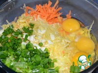 Чеснок и зеленый лук мелко нарезать. Смешать в чаше картофель, лук репчатый и зеленый, чеснок, морковь и яйца. Добавить специи. |