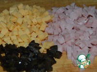 Ветчину и сыр нарезать кубиками, маслины измельчить. На самом деле начинку можно сделать любой, продукты беруться по вкусу. |