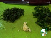 Режем зеленый лук не крупными кольцами ( сразу откладываем немного для подачи). Мелко режем укроп и чеснок. |
