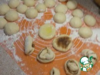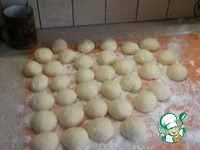 Катаем порционные колобки и выкладываем их на посыпанный мукой стол. Колобки должны немного растронуться. |