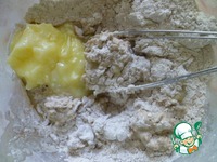 Влить половину картофельного отвара и добавить жир или смалец. Перемешать. |