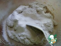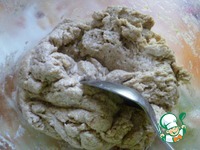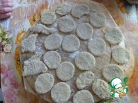 Выложить на противень с пергаментом. У меня пергамент некачественный, поэтому я для страховки посыпала его мукой. |