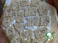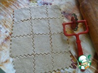 Часть теста тонко раскатать и с помощью обычного ножа или фигурного порезать на квадратики. |