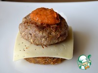 7. Собираем чизбургер: на кружок горячего жареного баклажана положить ложку томатного соуса, затем кусочек сыра, котлетку и еще томатный соус. |