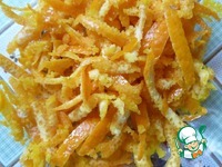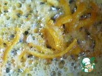 В это время делаю начинку. Крупной теркой снимаю цедру с апельсина. Стараюсь не задевать белую часть. Заливаю кипятком ним на 5-7. Воду сливаю. |