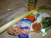 Далее, переложить креветки, и в этой же сковороде обжарить мелко порезанный шпинат, лук-порей и сладкий перец. |