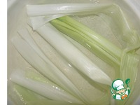 "Одежда для рыбки": Лук- порей разрезать вдоль, чтобы получились длинные пластины. Отварить в чуть подсоленной, закипевшей воде 2 минуты, и обдать холодной водой. |