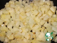Картошку чистим, нарезаем на кубики и отправляем в сковородку. Жарим на сильном огне 5 минут. Солим, перчи по вкусу и перемешиваем. Затем перекладываем картофель в жаропрочную форму. |
