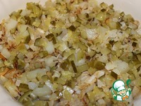 Соленый огурец мелко нарезаем и выкладываем сверху лука. |
