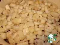 Рыбу нарезать и слегка притушить. Посолить и переложить в форму. Грушу чистим и мелко нарезаем. Выкладываем сверху на рыбу. |