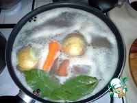 Когда бульон закипит, появится пенка, которую нужно снимать периодически. |