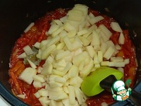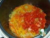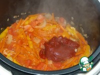 Практически сразу же вслед за помидорами, добавить томатную пасту. Перемешать и продолжать жарку минуты 3-4. На этом этапе, если программа не закончилась, то отключаем сами. |