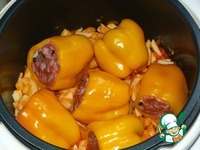 Выложить в чашу сельдерей и перец. Перемешать и продолжать обжаривать минуты 3-4. |