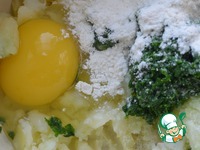 Толченный картофель смешиваем со шпинатом, солим, перчим, добавляем сыр, яйца, муку и тщательно все вымешиваем |