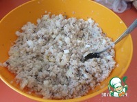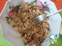Сардины, вместе с маслом, мнем вилкой и добавляем к луку и яйцам. |