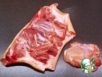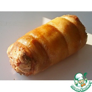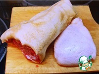 С голяшки срезаем мясо так, чтобы оно осталось на шкурке. Для этого сначала надрезаем ножом шкурку вдоль голяшки. Надрезаем до кости. Затем, аккуратно работая ножом вдоль кости, вырезаем эту кость. Теперь на очереди - курица. Срезаем мякоть так, чтобы не осталось никаких косточек. Раскладываем мясо равномерно на шкурке. Срезаем, если надо, излишки мяса с одного места и перекладываем на другое. Посыпаем мясо специями и солью. Массируем мясо, втирая соль. Соли нужно взять 2 % от веса мяса, тогда солёность рулета будет оптимальной. Специй слишком много класть не стоит. Если вы любите чеснок, то вместо сухого можно взять свежий. Неплохо добавить ещё и чайную ложечку мелкого желатина - рулет получится по-плотнее.
