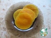 Тыкву нарезать на тонкие пластины толщиной несколько мм. Бланшировать до мягкости, можно просто положить в кипящую воду (сняв с огня) на 5-10 минут, чтобы пластины стали гибкими, но не разваливались. |