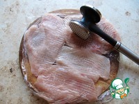 Филе курицы (индейки) отбить тонко, но нужно избежать разрыва филе, посолить по вкусу, добавить перец. |