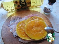 Сверху филе выложить пластины тыквы (можно в несколько слоев), тыкву смазать для сочности растительным маслом IDEAL Подсолнечный, слегка посолить, поперчить. |