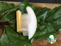Большие свекольные листья моем, рыбу режем на небольшие кусочки, грушу на дольки, сыр на брусочки. Я делала 8 штук, поэтому у меня 8 листьев, 8 долек груши, 8 кусочков рыбы и 8 брусочков сыра. |