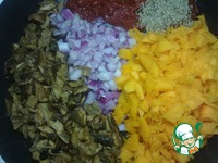 Теперь режем мелко луковицу, а также измельчаем грибы. Всё выкладываем на сковороду, добавляем измельченную тыквенную мякоть, томатную пасту, розмарин. Готовим эту смесь в течение 7 минут. |