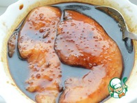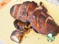 Заворачиваем грудку в фольгу или пекарскую бумагу, хорошо заворачиваем, поливаем соусом, чтобы не пролилось ничего. Выпекаем 40-50 мин при средней температуре. Достаем, остужаем и нарезаем. |