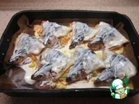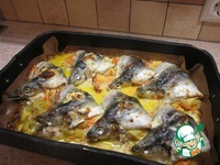 Морковка + картофель + 2/3сливок = перемешать, посолить по вкусу. Нафаршировать рыбку, закрепить зубочисткой. |