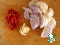 Лук нарежем полукольцами, перец чили тонкими ломтиками и чеснок измельчим. |
