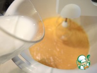 Частями всыпать муку и частями вливать молоко. Перемешать, но не долго. Тесто получается немного гуще, чем на бисквит. Поставить в холодильник на 15-20 минут. |