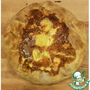 Делаем соус: 5 яиц смешать с пармезаном и сливками, посолить и поперчить. Заливаем пирог этой вкуснятиной. ставим в духовку на 40-50 минут. |
