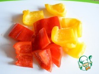 После того как мясо замариновалось, из сладкого перца удаляем семена и разрезаем на крупные кубики. |