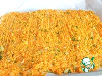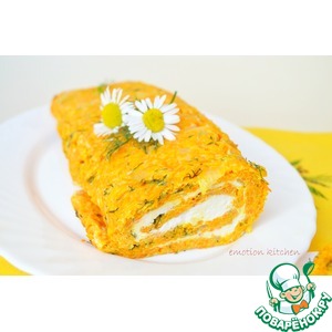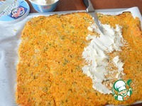 Выстилаем противень пекарской бумагой и смазываем маслом. Выкладываем морковную смесь и разравниваем. Не делайте слишком тонкий слой, рулет будет ломаться. |