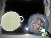 На плиту ставим: кастрюлю с водой, в которую кладем одну ст. ложку крупной соли и сковороду, в которую наливаем масло из под шпрот. Как масло разогреется кладем в сковороду лук. |