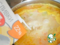 Солим, добавляем приправы и вливаем сливки. Перемешиваем и выключаем плиту. Даем супу немного постоять. |