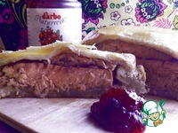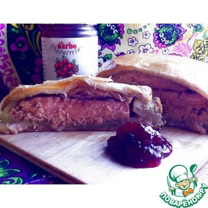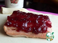 Раскатать, слоеное тесто. Филе слегка промокнуть бумажным полотенцем и выложить на тесто кожей вниз. Смазать клюквенным соусом D'arbo. |