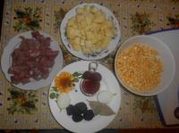 Горох предварительно замочить на несколько часов в холодной воде, затем хорошо промыть. Поставить кипятиться чайник. Картофель почистить, нарезать кубиками. Мясо нарезать небольшими кусочками |