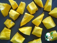 Для бисквита. Тыкву вымыть, очистить от кожуры, нарезать на кусочки и запечь в духовке до готовности. |